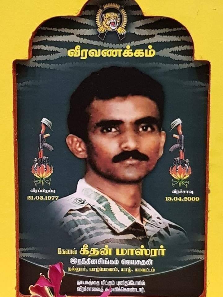 கேணல் கீதன் மாஸ்டர் இந்த இடத்தில் இந்த போராளியைப் பற்றி கூறியே ஆகவேண்டும். எத்தனையோ வசதி வாய்ப்புக்கள் இருந்தும் தனது குடும்பம் வெளிநாட்டில் வசித்தாலும் தமிழீழ விடுதலையை தன் உயிர் மூச்சாக நினைத்து பீசிங் எனப்படும் முட்டு வருத்தத்தின் மத்தியிலும் தலைவனையும் சக போராளிகளையும் உயிராக நேசித்த உன்னதமான போராளி கேணல் கீதன் தன் ஏலாத உடல் நிலையிலும் தலைவரின் எண்ணங்களுக்கு 100% செயல் வடிவம் கொடுக்க வேண்டும் என்று தானும் கால நேரம் பாராமல் செயல்பட்டு தன் சக போராளிகளையும் செயற்பட வைத்த அரிய செயல்பாட்டாளன். லெப்.கேணல் ராஜன் கல்விப் பிரிவு தொடங்கி லெப் கேணல் திலீபன் கல்லூரி வரை தலைவரின் எண்ணக்கருவுக்கு ஏற்ப உருவாக்கி திறம்பட செயலாற்றிய அரிய தளபதிகளில் ஒருவர் பல திறமையான போராளிகளை இனங்கண்டு தலைவரின் கவனத்துக்கு கொண்டு சென்ற அற்புதமான தளபதி.பூனகரிபடையணி உருவாக்கத்தின் கதாநாயகன். மன்னார் களமுனை தொடக்கம் முள்ளிவாய்க்கால்களமுனை வரைபூனகரிப்படையணியின் அற்புதமான வரலாற்று சமர்களை கேணல் ஈழப்பிரியனோடு சேர்ந்து வழிநடத்தி சாதனைகள் செய்த அற்புத தளபதிக்கு வீரவணக்கம். இவருடன் வீரச்சாவடைந்த அனைத்து மாவீரர்களுக்கும் வீர வணக்கம்